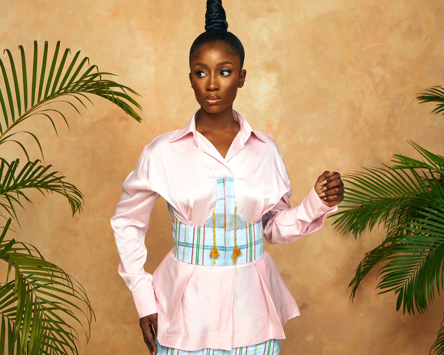 Corset Silk Shirt with long sleeves and a knee length Skirt